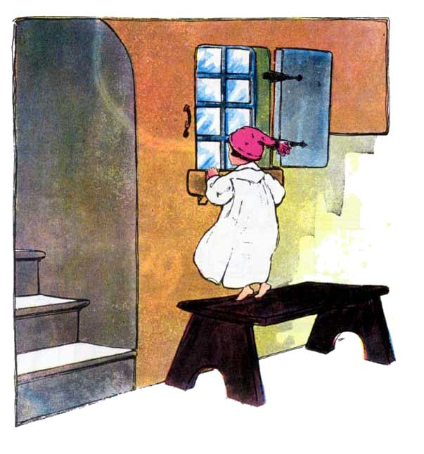 Upstairs and downstairs, in his nightgown;