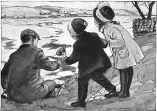 “Now let’s walk up the river above the dam, children,” said father. “The water was over the road in one place. It brought big cakes of ice nearly to the road.”