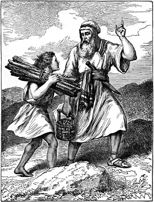 One day God told Abraham to take his son Isaac, and to journey into the land of Moriah; there to build an altar and offer Isaac as a sacrifice upon it. It was a strange command, but Abraham knew that God would not bid him do what was wrong, and believed that even if he slew his son, God was able to raise him to life again. So he rose early in the morning, saddled his ass, took two of his young men, and wood for the fire; and then, accompanied by Isaac, started on his journey. On the third day they came near the place God had pointed out, and Abraham left the young men with the ass, while he and his son journeyed up the mountain alone. As they went along, Isaac—who carried the wood, while his father carried the knife and the fire, said: “My father.” And Abraham replied, “Here am I, my son.” Then Isaac said: “Behold the fire and the wood: but where is the lamb for a burnt offering?” Abraham answered: “My son, God will provide Himself a lamb for a burnt offering.”