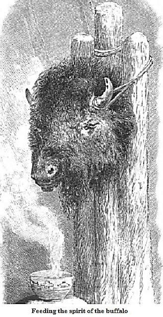 In the Indian wigwam where they were, there was a head of a dead buffalo. When dinner was over, the Indians filled a bowl full of meat. They set this down in front of the head. Then they said to the head, “Eat that.”