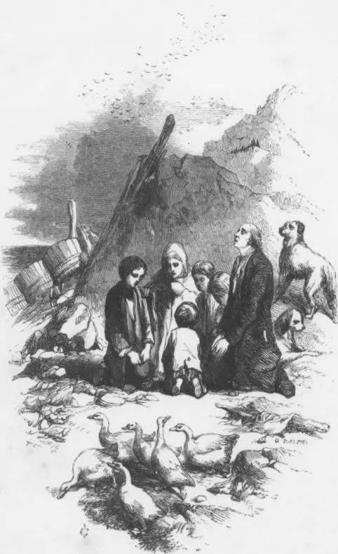 At length Fritz, overcome with fatigue, lay down and slept with his brothers. My wife and I, too anxious to rest, spent that dreadful night in prayer, and in arranging various plans. How gladly we welcomed the light of day, shining through an opening. The wind was subsiding, the sky serene, and I watched the sun rise with renewed hope. I called my wife and children on deck. The younger ones were surprised to find we were alone. They inquired what had become of the sailors, and how we should manage the ship alone.