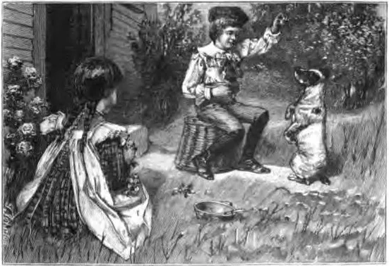 “Beg, Frisk, beg,” said little Harry, as he sat on an inverted basket, at his grandmother’s door, eating, with great satisfaction, a porringer of bread and milk. His little sister Annie sat on the ground opposite to him, now twisting her flowers into garlands, and now throwing them away.