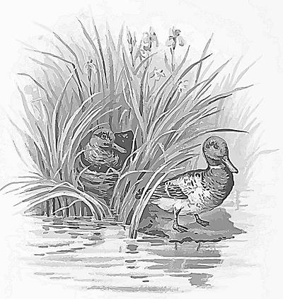 See the duck on the pond! Her nest is up on the bank, under the rock.
