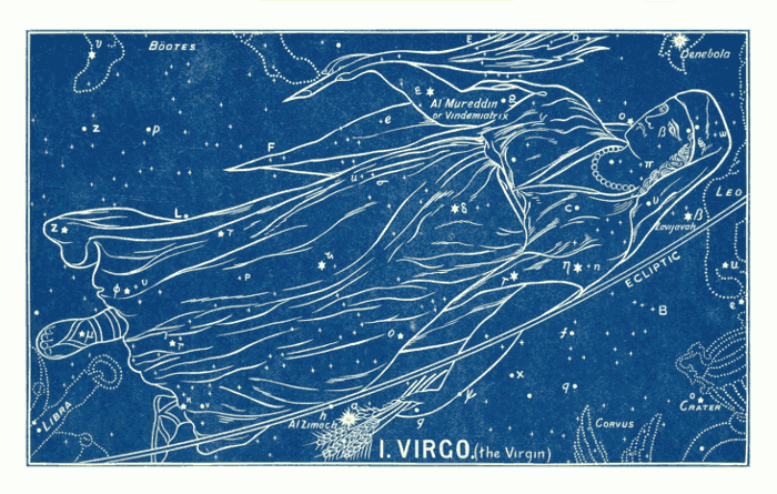 The name of this sign in the Hebrew is Bethulah, which means a virgin, and in the Arabic a branch. The two words are connected, as in Latin—Virgo, which means a virgin; and virga, which means a branch (Vulg. Isa. xi. 1). Another name is Sunbul, Arabic, an ear of corn.