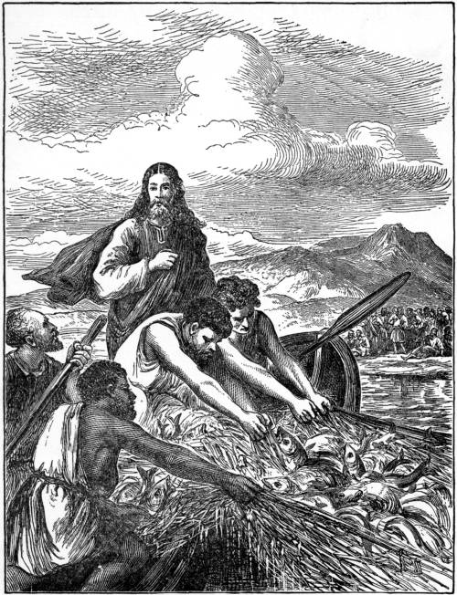 One day, as the crowds pressed round Him to hear the Word of God, Jesus came to the Lake of Gennesaret and saw two boats drawn up on the shore. Now one of these belonged to a man named Simon Peter, who was at the water’s edge washing his nets. Jesus entered into this boat and asked Simon to push it off from the land a little. Then He sat down and taught the people from the boat. And when He had done speaking to them, He said to Simon, “Launch out into the deep, and let down your nets for a draught of fishes.” Simon, answering Him, said, “Master, we have toiled all through the night and have taken nothing, but as you wish it I will let down the net again.” And they let down the net into the sea, but it enclosed so great a multitude of fishes that they could not draw them up, and the net brake. Then Simon beckoned to his partners, James and John, who were in the other boat, that they should come and help them. And they came and filled both boats with the fishes, so that they began to sink.