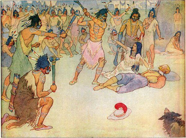 But it is certain that, whether Pocahontas saved his life at this time or not, he was much attached to her, and she became very fond of going to Jamestown, where she played with the boys in the street. When the settlers were in danger of starving, she brought them food. When a messenger was sent from Jamestown to carry an important message to Captain Smith, then in Powhatan’s country, she hid the man and got him through in spite of Powhatan’s desire to kill him. When the Indians intended to kill Captain Smith, she went to his tent at night and gave him warning. Captain Smith offered her trinkets as a reward, but she refused them, with tears in her eyes, saying that Powhatan would kill her if he knew of her coming there. These are the stories told of her in Captain Smith’s history. And when a number of colonists then in the Indian country were put to death, she saved the life of a colonist boy named Henry Spelman by sending him away.