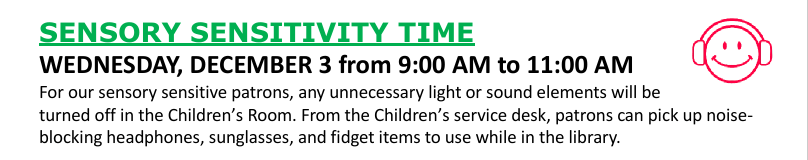 Notice how accommodating the library is. Various items are being provided by the library to help the children. Unnecessary light and sound elements are being turned off. The library is normally a quiet place. They are going above and beyond by offering to turn off any additional sound elements. I am thankful that the library is offering this. I have not had to use this with my daughter, because the library is already quiet enough for her. Everyone on the spectrum has different issues. It is not a one size fits all kind of thing. I am grateful that the library is trying to do something. I hope and pray that the churches step up and try harder to communicate with the parents about what the needs are and how they can help and support. I do know that the number 1 thing that they can do is take it seriously when the people say that the music is too loud.