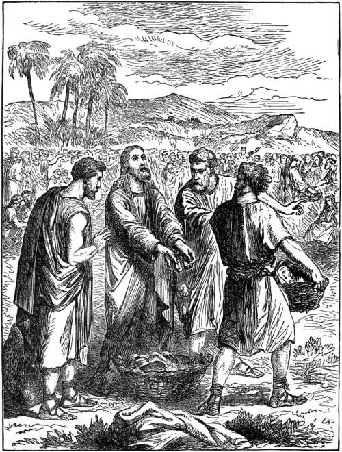 Jesus was too kind to send them away hungry like that. He said, “They need not depart; give ye them food to eat.” But they said to Him, “We have here but five loaves and two fishes, which we have just purchased of a lad.” He said, “Bring them to Me.” Then He told the people to sit down on the grass; and He took the five loaves and the two fishes, and looking up to heaven, blessed them and broke them into pieces. The disciples carried the bread and fish to the people, and they all ate and had plenty, although there were about five thousand men, besides women and children. And yet, when the disciples took up the fragments that were left, these fragments filled twelve baskets. How kind was Jesus! He not only taught the people and healed their sick, but He fed them when out in the desert place and hungry.