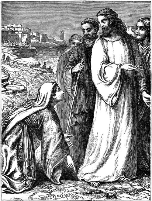 Jesus came unto the borders of Tyre and Sidon, where the people were not Jews, but Gentiles. And there came to Him a woman of Canaan, who cried out to Him, saying, “Have mercy on me, O Lord, Thou son of David; my daughter is grievously vexed with a devil.” She besought Him to cast out this evil spirit from her daughter. But He answered not a word, and His disciples counselled Him to send her away. Then He told her He was not sent unto the Gentiles, but unto the lost sheep of Israel; meaning the Jews. This was said to try her faith. Then she came and worshipped Him, saying, “Lord, help me.” But He said, “It is not meet to take the children’s food and to cast it to dogs;” meaning that His help was due rather to the Jews than to the Gentiles. And she said, “Truth, Lord, yet the dogs sometimes eat of the crumbs which fall from their masters’ table;” meaning that, though she was a Gentile, she believed in Him as the Son of God.