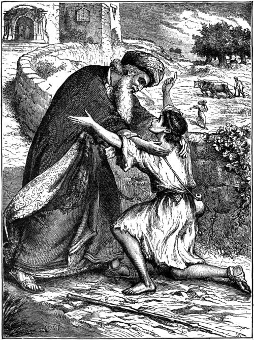 His sufferings brought him to his senses, and he thought how foolish he had been, for he remembered that his father’s servants had food enough and to spare, whilst his father’s son was perishing with hunger. He said, “I will leave this land and go to my father and tell him how I have sinned against heaven and him. I will tell him I am no longer worthy to be called his son, and will implore him to make me one of his hired servants.” And he arose and went towards his father’s house, but when he was still a great way off, his father saw him, and was sorry for him, and ran and embraced him. Then he told his father how he had sinned and had lost his title to be called the old man’s son, but the father was so glad to have his son come back repentant, that he told his servants to bring the best clothing and a ring to put on his son. And he made a great feast, and they were merry, for he said, “This is my son that was as one dead to me and is now alive again; he was lost and is found.”