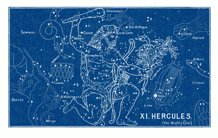 Here the mighty one, who occupies a large portion of the heavens, is seen bending on one knee, with his right heel lifted up as if it had been wounded, while his left foot is set directly over the head of the great dragon. In his right hand he wields a great club, and in his left hand he grasps a triple-headed monster (Cerberus). And he has the skin of a lion, which he has slain, thrown around him.