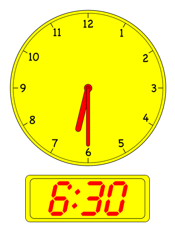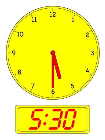 Tell children the minute hand points to the 6, for (6×5 = 30) 30 minutes past the hour.