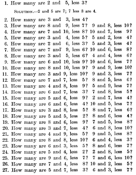 - Have children write out each problem and solution in equation form. For example, children write ‘2 + 5 – 3 = 4’ for ‘How many are 2 and 5, less 3?’