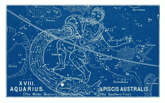 Can we doubt what is the interpretation of this sign? The Greeks, not knowing Him of whom it testified, were, like the woman of Samaria, destitute of that living water which He alone can give. They therefore invented some story about Deucalion, the son of Prometheus; and another, saying he is Ganymede, Jove’s cup-bearer! But, as an astronomer says, “We must account otherwise for the origin of this name; for it is not possible to reconcile the [pg 086]symbols of the eleventh49 sign with Grecian mythology.” No! we must go further back than that, and not cramp our vision, and distort the Scriptures, by confining our thoughts to “the Church.” The Church is nowhere seen in these Signs, as she is nowhere revealed in the Old Testament. This we shall enlarge on when we come to the sign Pisces. Meanwhile we must read the witness of the stars as if there had been no Church!