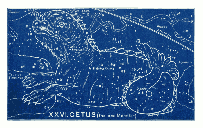 The brightest star, α (in the upper mandible), is named Menkar, and means the bound or chained enemy. The next, β (in the tail), is called Diphda, or Deneb Kaitos, overthrown, or thrust down. The star ο (in the neck) is named Mira, which means THE REBEL. Its name is ominous, for the star is one of the most remarkable. It is very bright, but it was not till 1596 that it was discovered to be variable. It disappears periodically seven times in six years! It continues at its brightest for fifteen days together. M. Bade says that during 334 days it shines with its greatest light, then it diminishes, till it entirely disappears for some time (to the naked eye). In fact, during that period it passes through several degrees of magnitude, both increasing and diminishing. Indeed its variableness is so great as to make it appear unsteady!