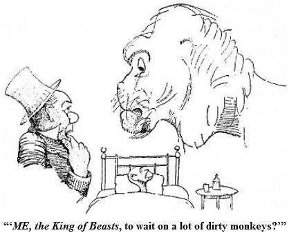 “Do you dare to ask me, Sir?” he said, glaring at the Doctor. “Do you dare to ask me-ME, the King of Beasts, to wait on a lot of dirty monkeys? Why, I wouldn’t even eat them between meals!”