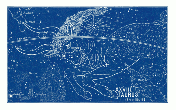 The stars in Taurus present a brilliant sight. There are at least 141 stars, besides two important groups of stars, which both form integral parts of the sign.