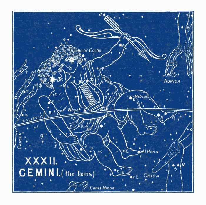 All the pictures of this sign are confused. The Greeks claimed to have invented them, and they called them Apollo and Hercules. They are given in our illustration. The Latins called the Castor and Pollux; and the name of a vessel in which Paul sailed is so called in Acts xxviii. 11, Διοσκούροι.