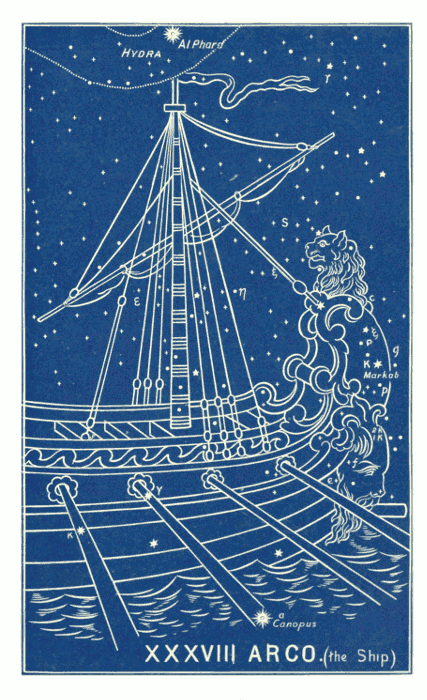 Its brightest star, α (near the keel), is called Canopus or Canobus, which means the possession of Him who cometh. Other star-names, not identified, are—Sephina, the multitude or abundance; Tureis, the possession; Asmidiska, the released who travel; Soheil (Arabic), the desired; and Subilon, the Branch.