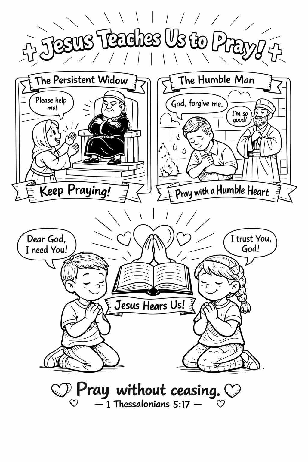 Jesus told a story about a woman who needed help. She went to a judge and asked again and again. The judge wasn’t kind, but he finally helped her because she didn’t give up.