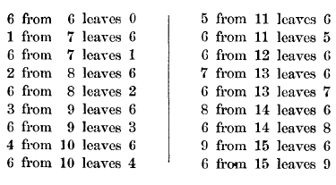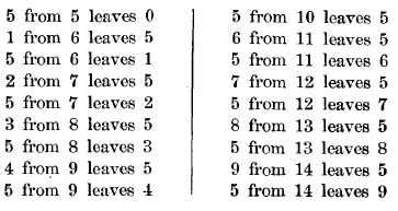- Repeatedly separate a group of objects into smaller groups per the table below. For example, 7 pencils from 7 pencils leaves 0 pencils, 7 coins from 9 coins leaves 2 coins, and 9 cars from 16 cars leaves 7 cars, etc.