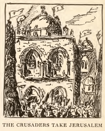 In the year 1096 this official First Crusade started upon its long voyage. At Constantinople the knights did homage to the Emperor. (For as I have told you, traditions die hard, and a Roman Emperor, however poor and powerless, was still held in great respect). Then they crossed into Asia, killed all the Muslims who fell into their hands, stormed Jerusalem, massacred the Muslim population, and marched to the Holy Sepulcher to give praise and thanks amidst tears of piety and gratitude. But soon the Turks were strengthened by the arrival of fresh troops. Then they retook Jerusalem and in turn killed the faithful followers of the Cross.