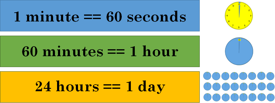 Review the definition of seconds, minutes, and hours. Show the children the magnitude of 1 second, 1 hour, and 1 day, in the context of a clock as shown below.