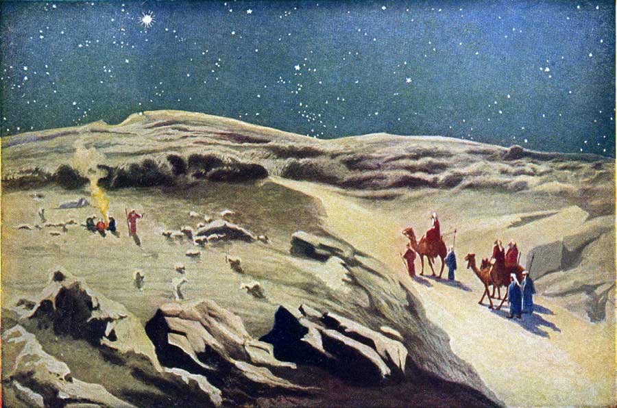 In a country east of Judea, and many miles distant, were living some very wise men who studied the stars. One night they saw a strange star shining in the sky, and in some way they learned that the coming of this star meant that a king was soon to be born in the land of Judea. These men felt a call of God to go to Judea, far to the west of their own home, and there to see this new-born king. They took a long journey, with camels and horses, and at last they came to, the land of Judea, just at the time when Jesus was born at Bethlehem. As soon as they were in Judea, they supposed that every one would know all about the king, and they said:
